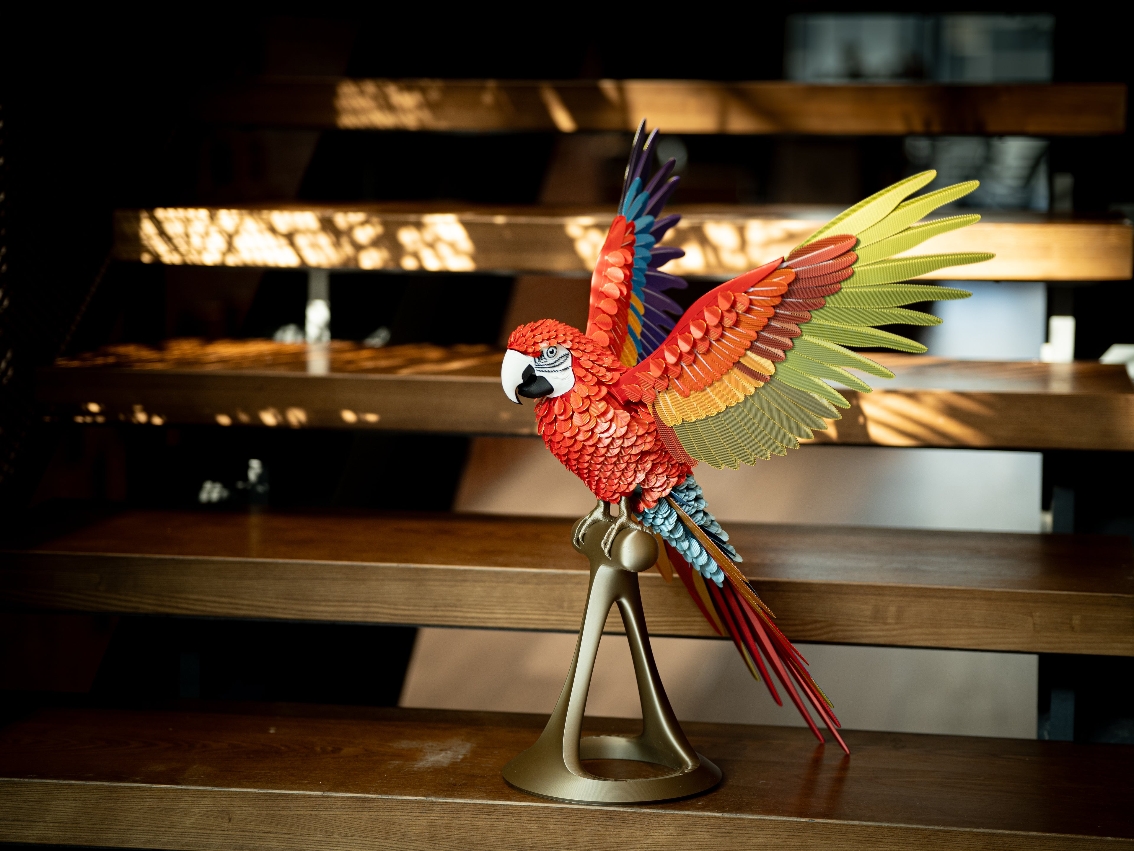 A stunning life-size macaw sculpture, entirely crafted in 3D, showcasing remarkable detail and realism. The body is covered with layered, feather-like textures that mimic the natural plumage, predominantly in vibrant red, complemented by accents of blue, green, and yellow on the wings and tail. The wings are elegantly extended, giving the impression of motion and lifelike presence. The head features a carefully sculpted white facial area with delicate line patterns and a glossy black beak, enhancing its realistic appearance. This piece beautifully blends artistry and precision, making it a striking decorative object or collectible.